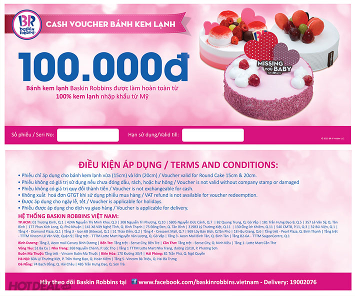 Thưởng Thức Hương Vị Tuyệt Hảo, Mát Lạnh Từ Bánh 100% Kem Lạnh Baskin Robbins 31 Hương Vị Nổi Tiếng Thế Giới. Voucher 100,000 VNĐ, Còn 75,000 VNĐ, Giảm 25%. Chỉ Có Tại Hotdeal.vn!. Giá 100,000 VNĐ, Còn 75,000 VNĐ, Giảm 25%. Chỉ Có Tại Hotdeal.vn!