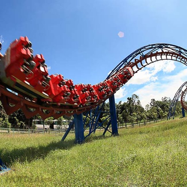 + Tàu lượn siêu tốc thiết kế bởi những vòng xoắn tròn 360 độ, chiều dài đường ray 680m. Du khách chắc chắn sẽ trải qua cảm giác mạnh và thích thú tột cùng khi nhào lộn từ độ cao tối đa 33,6m rồi đổ xuống với vận tốc 75km/h.