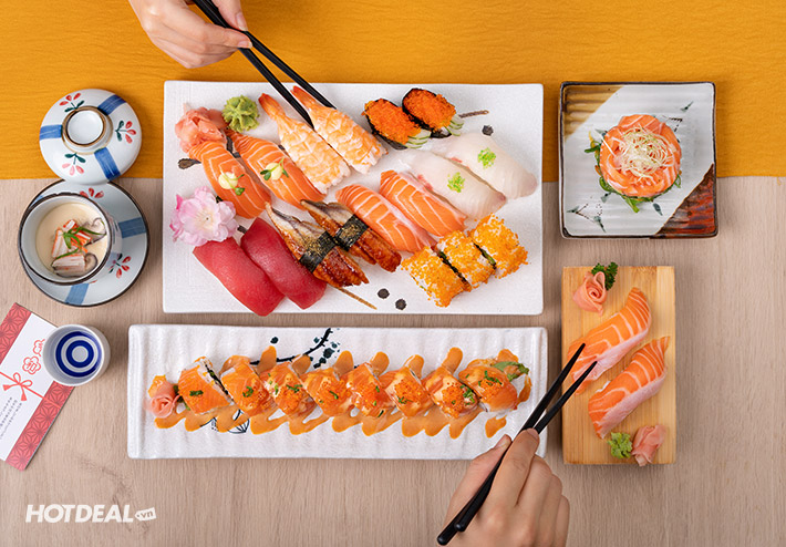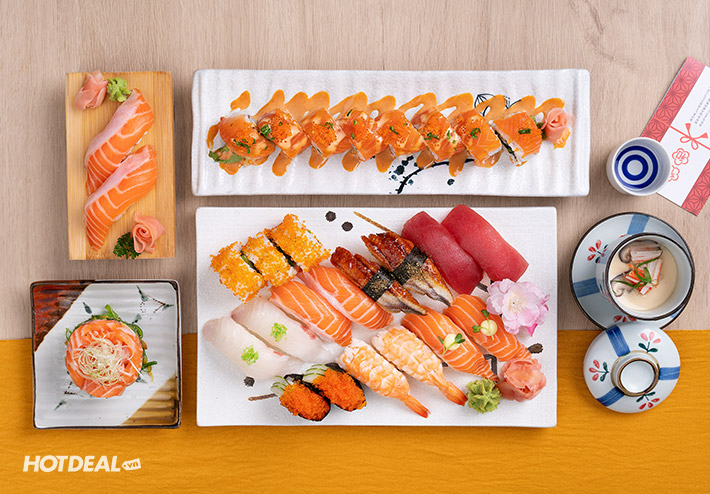 Sushi là sự kết hợp tinh tế đến từ vị ngọt của gạo Nhật, chút chua nhẹ của giấm shari và vị ngon của các loại thịt, hải sản tạo nên hương vị không thể chối từ. Những món sushi mà bạn không thể bỏ qua trong thực đơn buffet lần này là: California cá hồi núi lửa, California bò nướng, Nigri lươn, Nigiri bạch tuộc, Nigiri cá hồi, Nigiri cá ngừ, Gunkan cá hồi trộn sốt, Gunkan trứng cua thập cẩm, Maki cá hồi...