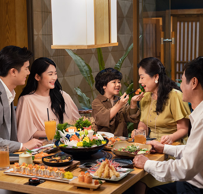 Với tiệc Buffet Kiku, thực khách sẽ được trải nghiệm các loại sashimi cá Kampachi, cá saba ngâm dấm, tôm, cá vược, mực, bạch tuộc, cá ngừ tươi ngon ăn không giới hạn mang tới cho thực khách những trải nghiệm và cảm xúc Nhật thực thụ.
