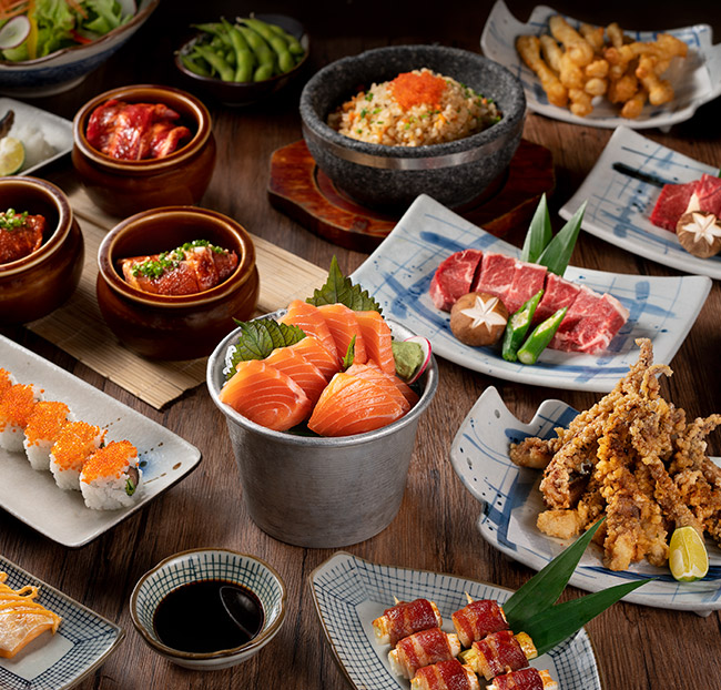 + Hơn 30 món nhậu chuẩn phong cách Izakaya cho bàn tiệc đủ đầy, thêm phần hứng khởi: Râu mực Karaage, Lườn cá hồi sốt mayo cay, Cánh gà chiên kiểu Nhật, Cá saba nướng muối, Cá trứng nướng muối...