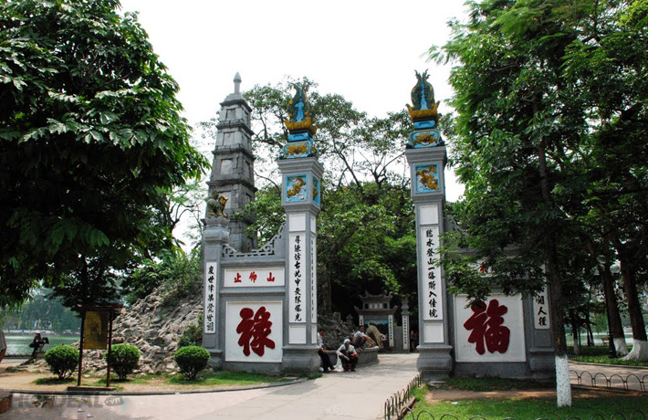 - Chùa Trấn Quốc - di tích đạo Phật và là di sản quốc gia, nằm trên một mặt của Hồ Tây.