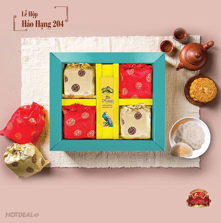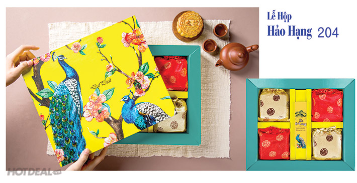 + Lễ hộp 204: 3 bánh trung thu Hồng Kông cao cấp 2 trứng 200g (1 nhân mặn, 1 nhân ngọt); 1 bánh trung thu dẻo hạnh nhân hạt dẻ 1 trứng 200g; 1 hộp trà Ôlong 10g.