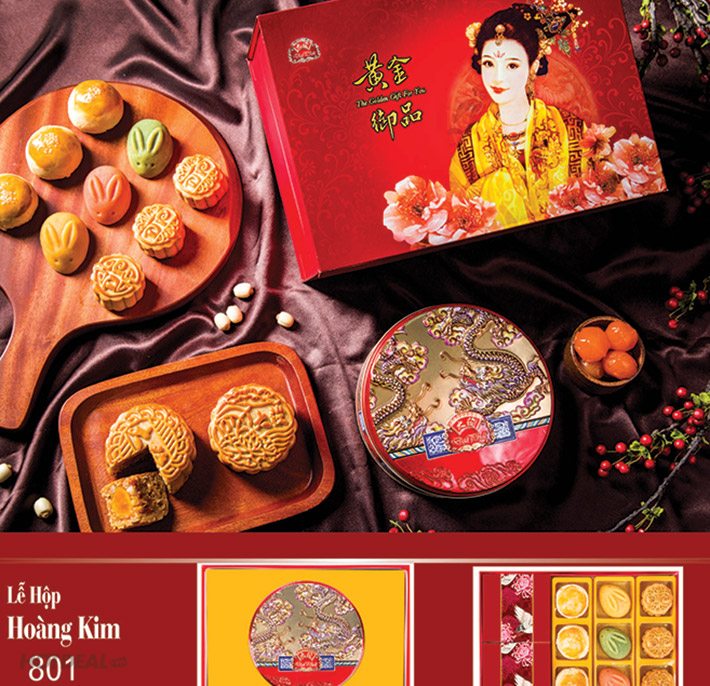 Đặc sắc hơn là Lễ Hộp Hoàng Kim 801 với sự sang trọng bắt mắt đến từ mẫu mã. Nắp hộp là một bức tranh thiếu nữ dịu dàng bên hoa tạo ra một cảm giác tao nhã và ngọt ngào. Đây là một lễ hộp đặc biệt thu hút bởi sự tinh tế với hình ảnh thiếu nữ được in bằng kĩ thuật dập nổi 3D đây sống động và chân thật. Bên trong hộp là hai tầng bánh rất sáng tạo gây nên cảm giác bất ngờ được sở hữu một lễ hộp trang trọng, đẳng cấp đến thế. Cách sắp đặt giữa hai tầng cũng rất đặc biệt: Tầng trên là dòng bánh cao cấp đúng chất Đại Phát: Bánh Thu nguyệt XO hải sản. Tầng dưới là các dòng bánh thú vị rất được ưa chuộng: bánh Trung thu Hồng Kong, bánh Qúy Phi Phù Dung, bánh Thỏ Con Như Ý. Tặng một hộp quà Hoàng Kim là tặng một tấm chân tình thượng hạng, khiến niềm vui Trung thu nhân lên bội phần.