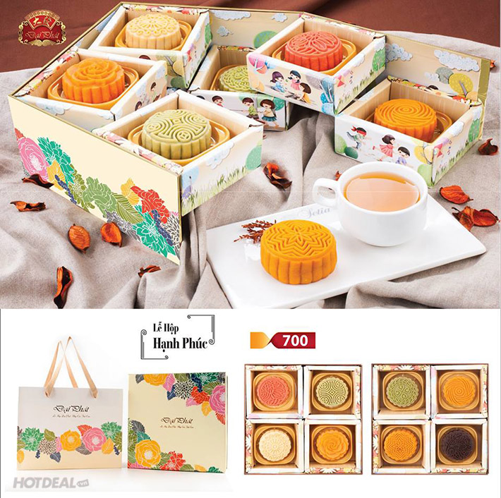 Đáng chú ý là sản phẩm Lễ Hộp Hạnh Phúc 700 với Chiếc hộp Hạnh phúc được thiết kế hai tầng đặc biệt với kết cấu lạ mắt cùng hoa văn tươi mát, mang lại trải nghiệm thú vị cho bạn khi mỗi lần mở từng ngăn hộp bánh, như mở ra cả kí ức tuổi thơ Trung thu ngọt ngào, với niềm vui trông ngóng những chiếc bánh nướng, bánh dẻo ngon lành. Nhân bánh cực kì tuyệt hảo với hầu hết các loại bánh lừng danh của Đại Phát: bánh trung thu cầu vồng vải mè đen, bánh trung thu cầu vồng hải sản X.O, bánh trung thu cầu vồng phô mai, bánh trung thu cầu vồng sữa dừa mứt cam, bánh trung thu cầu vồng Macadamia Dừa dứa, bánh trung thu cầu vồng Macadamia Xoài, bánh trung thu cầu vồng Bào ngư Gà hầm Hạt sen, bánh trung thu cầu vồng Chocolate Lava.