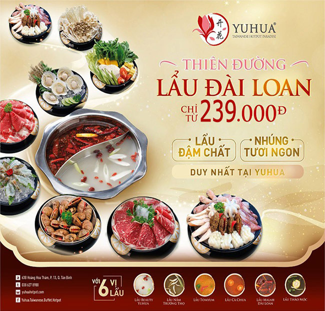Yuhua Hoàng Hoa Thám - Buffet Lẩu Đài Loan Hơn 80 Món Nhúng. Voucher 274,000 VNĐ, Còn 239,000 VNĐ, Giảm 13%. Chỉ Có Tại Hotdeal.vn!
