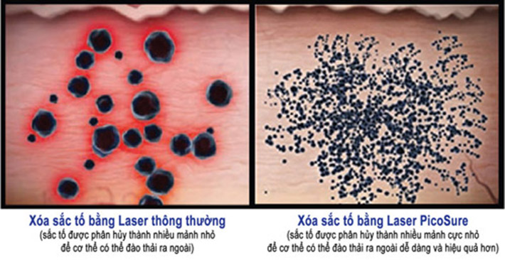 - Điểm bắn Laser siêu nhỏ mịn và phân hủy hắc tố bào thành từng mảnh để các đại thực bào sẽ đào thải thông qua con đường bạch huyết.