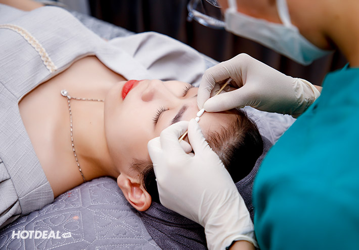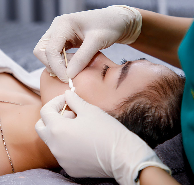 Vùng da điều trị sẽ được làm sạch giúp lấy đi mọi bụi bẩn, lớp sừng, sau đó bôi kem làm tê chuyên dụng giúp bảo vệ da và tạo điều kiện thuận lợi trong suốt quá trình điều trị.