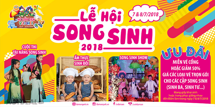+ Lễ Hội Song Sinh: diễn ra trong 2 ngày 7 & 8/7/2018 với các sân chơi hấp dẫn dành cho các cặp song sinh, sinh ba, sinh tư, … “Tài Năng Song Sinh”, “Ẩm Thực Sinh Đôi”, “Song Sinh Show”
