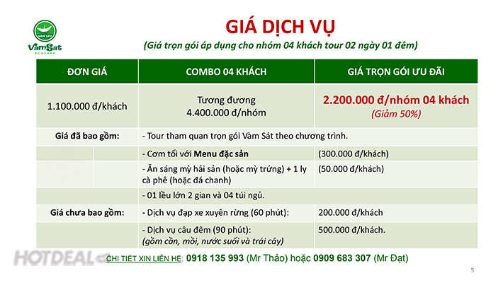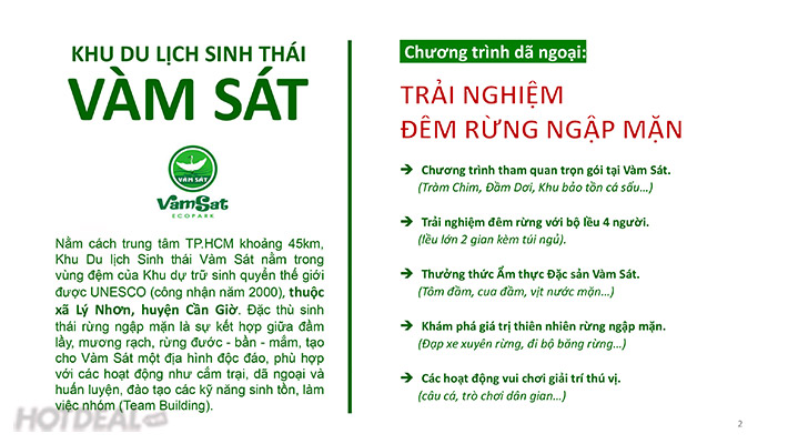 Khu Du Lịch Sinh Thái Vàm Sát Cần Giờ – Combo Vé Trọn Gói Vào Cổng + Thưởng Thức Ẩm Thực Đặc Sản + Trải Nghiệm Đêm Rừng Ngập Mặn Cho 04 Người Trong 02 Ngày 01 Đêm. Voucher 4,400,000 VNĐ, Còn 2,200,000 VNĐ, Giảm 50%. Chỉ Có Tại Hotdeal.vn!