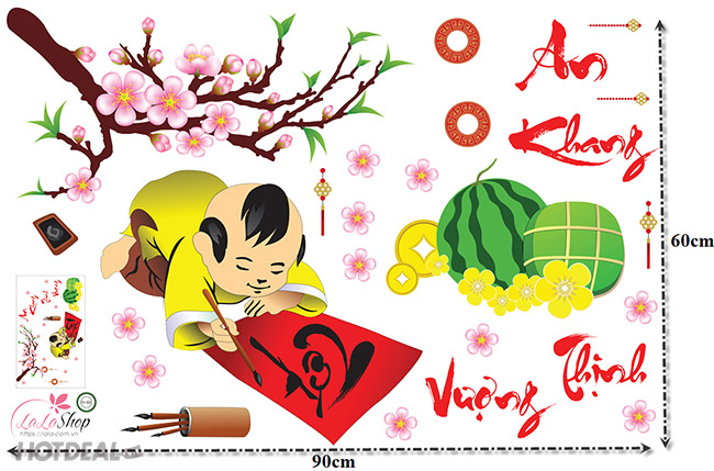 Decal Dán Kính Dán Tường In 3D Độc Đáo Trang Trí Tết Bộ 3 Lalashop Bé Viết Thư Pháp