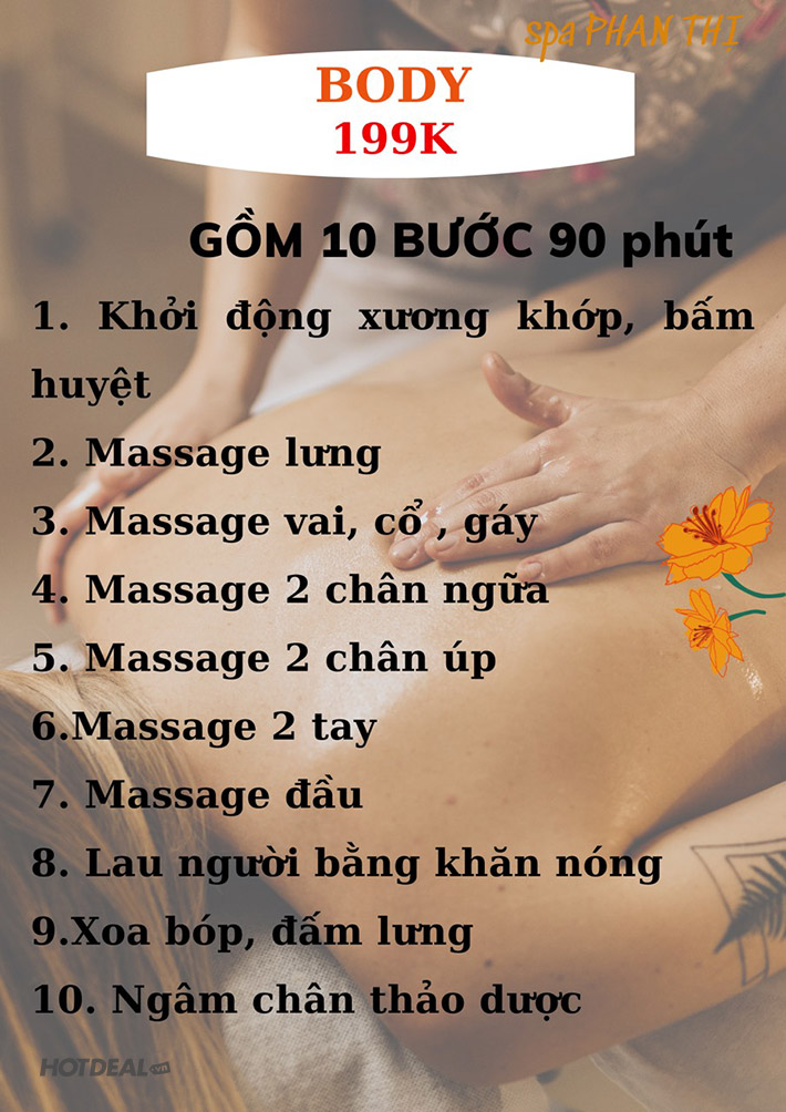 Spa Phan Thị - Trọn Gói Massage Body Trị Liệu, Thư Giãn 90 Phút. Voucher 250,000 VNĐ, Còn 199,000 VNĐ, Giảm 20%. Chỉ Có Tại Hotdeal.vn!