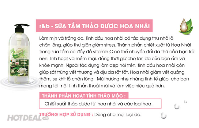 Sữa Tắm Thảo Dược R&B Hoa Nhài 600ml Hàn Quốc – Chiết Xuất Từ Các Thành Phần Thiên Nhiên Nuôi Dưỡng Làn Da Mềm Mượt, Trắng Sáng – Hương Thơm Quyến Rũ, Thu Hút. Giá 178,000 VNĐ, Còn 139,000 VNĐ, Giảm 22%. Chỉ Có Tại Hotdeal.vn!