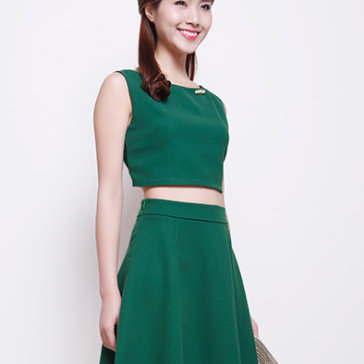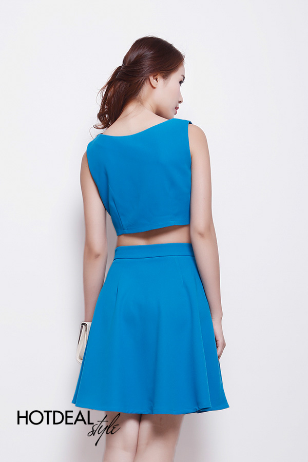 Set Áo Croptop Đính Hạt + Chân Váy Xòe Màu Xanh Két