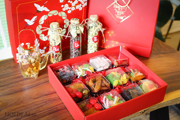 + 7 Hộp Mứt (120gr/ hộp) - Mix 20 loại mứt: Chuối, kiwi, cherry, xí muội đào, xí muội táo, chà là không hạt, chanh bao tử, nho, táo tào, khoai sâm, đào vàng bổ đôi, kẹo dẻo, dâu tây, dâu tằm, bí, dừa sữa non.