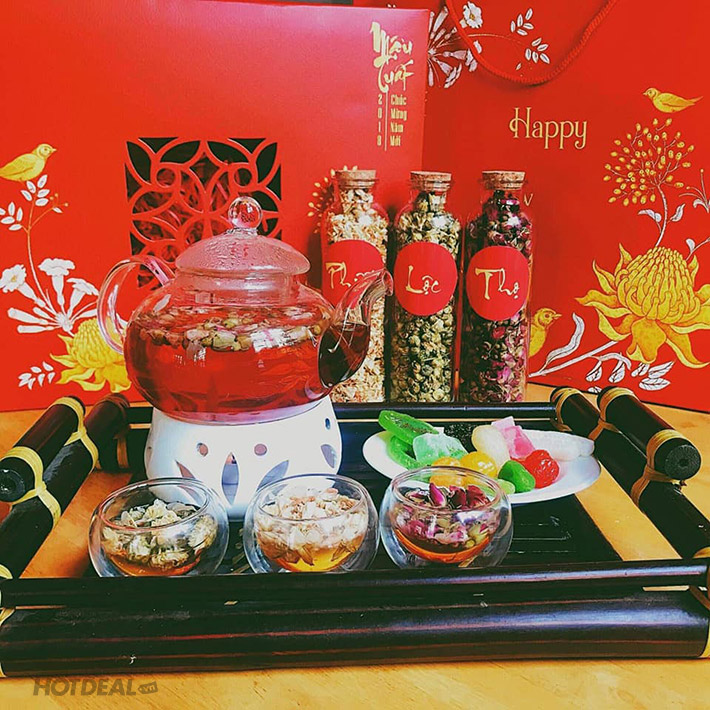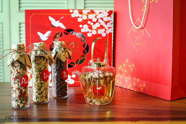 + 1 Trà Bạch cúc (220gram): Trà bạch cúc kèm với kỉ tử một vị trà mang đậm chất Tết có hương thơm dịu giúp mát gan, thanh nhiệt giải độc, bổ não và chữa suy nhược thần kinh giúp an thần dễ ngủ.