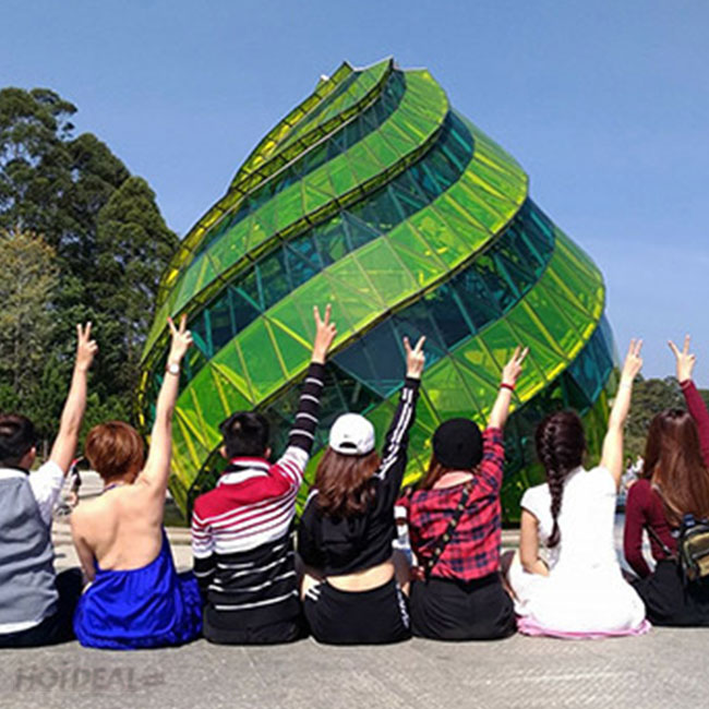 8h00: Xe đưa đoàn tham quan Quảng trường Lâm Viên, kế bên bờ Hồ Xuân Hương. Độc đáo với 2 khối hoa khổng lồ đó là khối hoa Dã quỳ và khối hoa Atiso kết hợp nhiều tấm kính màu độc đáo.