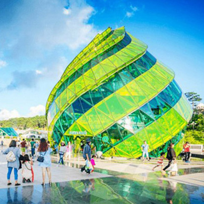 Tiếp đến, xe đưa đoàn tham quan và chụp hình tại Quảng trường Lâm Viên - Tọa lạc phía mạn phải của Hồ Xuân Hương - Một biểu tượng mới của thành phố hoa nơi đã ấn tượng mạnh mẽ với bao du khách nhờ có hai công trình nghệ thuật khổng lồ là khối Hoa Dã Quỳ và khối Atisô được xây dựng từ những tấm kính màu lạ mắt.