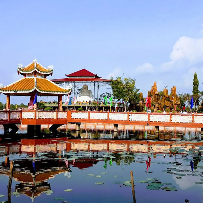 Đò cặp bến, xe đưa đoàn đi viếng Thiền viện Phương Nam – ngôi chùa lớn nhất miền Tây, kiến trúc truyền thống Việt Nam. Tượng Phật và toàn bộ nội thất trong chùa được tạc và làm bằng các loại gỗ quý hiếm đưa về từ Nam Phi.