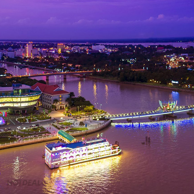 Tối: Đoàn dùng cơm tối trên du thuyền Cần Thơ. HDV và xe đưa đoàn đi dạo bến Ninh Kiều. Lên cầu đi bộ Ninh Kiều, được bắc qua rạch Khai Luông, nối bến Ninh Kiều và cồn Cái Khế. Quý khách có thể tự do đi dạo phố đêm đến với các làng ẩm thực, khu vui chơi giải trí, trung tâm thương mại ở thành phố Tây Đô.