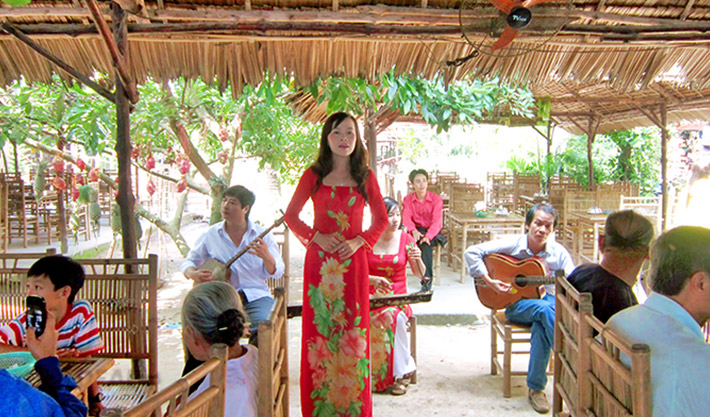 - Đoàn ghé qua các lò làm bún, bánh tráng, cốm nổ, tìm hiểu về nghề thủ công truyền thống ở nông thôn. Đò tiếp tục đi vô các con rạch nhỏ, dừng lại ở một trong những nhà vườn của lão nông tri điền trên cù lao An Bình, tham quan một số nông cụ cổ truyền của miền Nam. Nghe đờn ca tài tử cải lương Nam Bộ và thưởng thức các loại trái cây theo mùa.