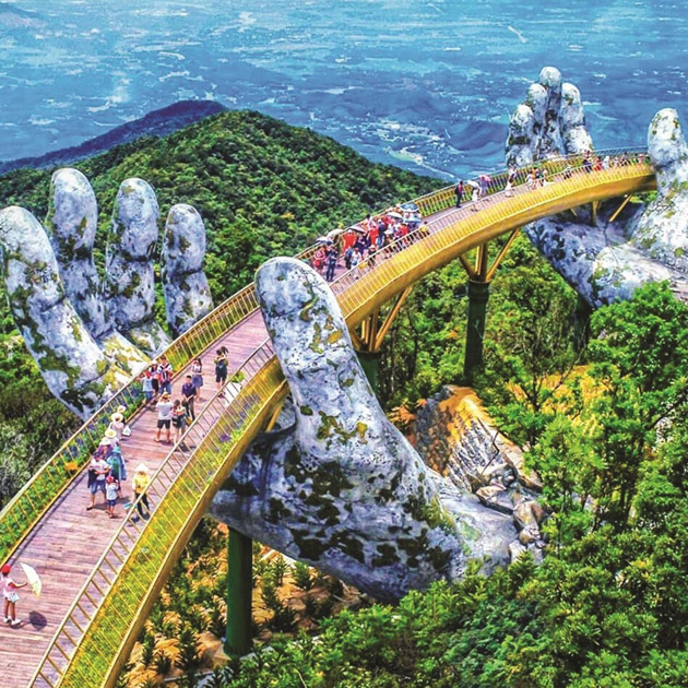 Cây cầu vàng với bàn tay khổng lồ đang nâng lên là điểm đến hot nhất tại Đà Nẵng mùa du lịch 2018. Cây cầu độc đáo này được xây dựng tại Bà Nà Hills. Hai bàn tay khổng lồ nâng đỡ cây cầu uốn quanh giống như người thiếu nữ đang nâng dải lụa vắt ngang qua rừng núi. Cây cầu nằm ở độ cao 1.400m, dài gần 150m gồm có 8 nhịp. Giữa phong cảnh thiên nhiên tươi đẹp của đỉnh Bà Nà, được dạo bước trên cây cầu này chẳng khác nào lạc vào chốn bồng lai tiên cảnh.