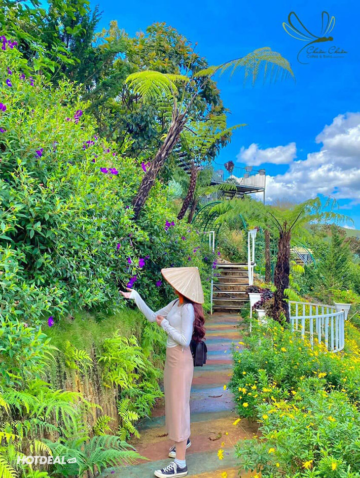08h30: Sau khi chinh phục con đèo Tà Nung mệnh danh là “Con đường tơ lụa Đà Lạt” tuyệt đẹp, quý khách dừng chân ăn sáng và kết hợp tham quan điểm du lịch siêu HOT Chuồn Chuồn Coffee & Bistro - một quán cafe với quy mô "khủng", kết hợp giữa thiên nhiên tươi mát và không gian hiện đại với phong cách vô cùng mới lạ, độc đáo. Nơi đây sẽ khiến bạn đứng ngồi không yên với Tháp Vọng Cảnh - tầng view 360 độ cực đỉnh, hồ vô cực, hồ cá Koi và khu cafe với những góc check-in cực kỳ sang chảnh.