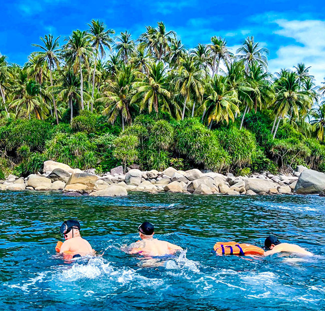 - HDV đưa đoàn đến bến tàu, bắt đầu chương trình tham quan câu cá và lặn ngắm san hô. Tàu đưa du khách đến những bãi đá san hô tuyệt đẹp, có thể lặn bắt nhum, thả cần câu câu cá, mực, bơi lội giữa làn nước biển trong xanh, vừa tự do, vừa hoang dã, khiến quý khách thích trải nghiệm và khám phá thiên nhiên càng thêm thích thú. Tại đây, quý khách sẽ được trải nghiệm thêm dịch vụ chèo thuyền SUP.