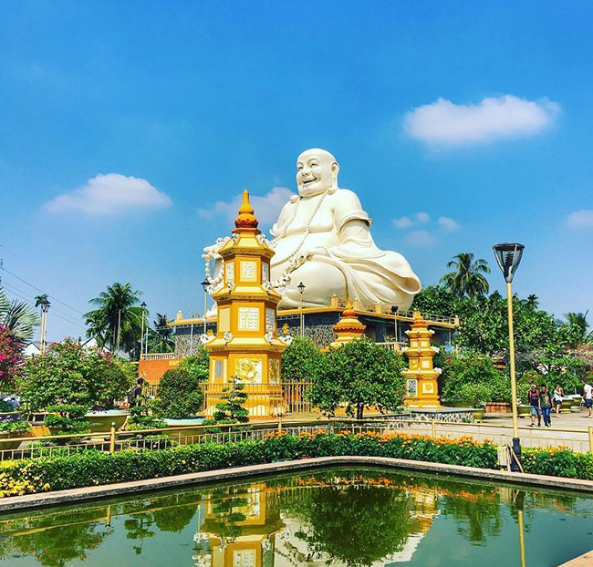 Trong hành trình này, đầu tiên du khách sẽ ghé thăm chùa Vĩnh Tràng một ngôi chùa nổi tiếng ở Nam Bộ, được xếp hạng Di tích Lịch sử - Văn hóa cấp Quốc gia và là một điểm hành hương và du lịch nổi tiếng. Chùa Vĩnh Tràng là ngôi chùa thờ Phật lớn nhất tỉnh Tiền Giang. Chùa mang dáng vẻ kiến trúc châu Á pha lẫn châu Âu. Chùa còn bảo tồn 60 tượng quý, được tạo tác bằng đồng, gỗ, đất nung. Chánh điện chùa Vĩnh Tràng còn có 7 bộ bao lam thếp vàng chạm hình Bát Tiên, thần Mặt Trời và thần Mặt Trăng.